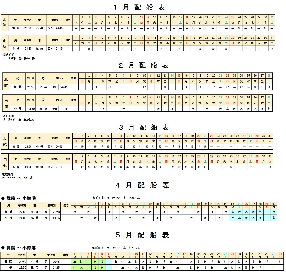 【舞鶴~小樽 運航ダイヤ】<ご利用船舶:けやき/あかしあ>
